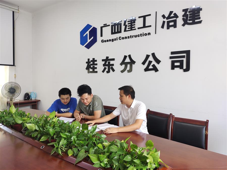 劉宇全(右1)和同事業(yè)務(wù)交流
