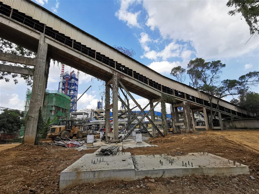 251砂巖長皮帶機(jī)輸送廊是魚峰水泥廠唯一一條進(jìn)砂巖破碎料的輸送鏈,是廠內(nèi)生產(chǎn)原料的臍帶。本次接駁任務(wù),業(yè)主要求在七天時間內(nèi)完成拆除重建工作,是歷次接駁工作中工期最緊、任務(wù)最重的一次接駁工作,各項專業(yè)工作必須需銜接緊密,環(huán)環(huán)相扣。同時,需拆除的八跨斜廊道均為預(yù)制梁板結(jié)構(gòu),高度大,拆除環(huán)境復(fù)雜,廊道下方有已完工的設(shè)備基礎(chǔ)、正在運(yùn)行的皮帶機(jī)輸送廊及高壓電纜溝需要進(jìn)行保護(hù),施工風(fēng)險高、難度大。