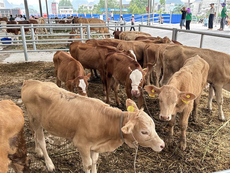 活動現(xiàn)場,熱鬧非凡,大家參觀了農(nóng)特項目園區(qū)及桂中牛行,并對園區(qū)今后的發(fā)展提出了意見和建議。桂中牛行作為農(nóng)特項目園區(qū)內(nèi)的首個主力商家,主營活牛羊交易,副營馬、驢、騾子等草食動物交易。試業(yè)當天,牛群“哞哞”聲此起彼伏,一頭頭體格健壯的牛兒一字排開,人們?nèi)宄扇旱貒墼谝黄穑屑毺暨x著心儀的牛兒。一旁的牛崽交易市場內(nèi),買家更是爭相搶購體態(tài)良好的牛崽,市場交易紅火。