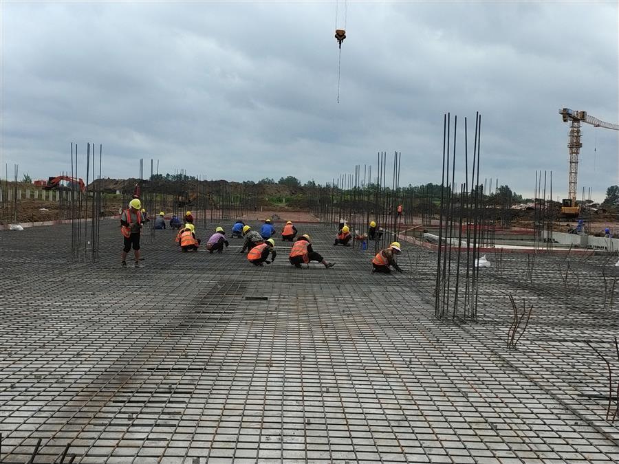 “日均投入施工技術(shù)人員500余人、各類機(jī)械設(shè)備45臺(tái)搶抓施工節(jié)點(diǎn)?!表?xiàng)目負(fù)責(zé)人禤旭云說(shuō),自6月開(kāi)工以來(lái),針對(duì)項(xiàng)目工期緊、任務(wù)重的情況,項(xiàng)目部按照“開(kāi)工即攻堅(jiān)、起步即沖刺”的要求,全面推進(jìn)項(xiàng)目建設(shè)。目前,中試車間基礎(chǔ)回填、褥墊層鋪筑、墊層澆筑、剛性地面鋼筋綁扎完成;1#生產(chǎn)車間53~56軸獨(dú)基開(kāi)挖基礎(chǔ)承臺(tái)鋼筋綁扎、模板安裝、砼澆筑完成,48~52軸基礎(chǔ)開(kāi)挖、墊層澆筑完成;2#生產(chǎn)車間18~25軸基礎(chǔ)承臺(tái)鋼筋綁扎、模板安裝、砼澆筑完成;倉(cāng)庫(kù)基礎(chǔ)梁全部完成。