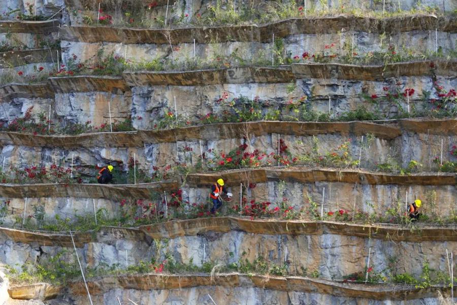 “我們已經(jīng)在山上種下了25萬多株各類苗木。”工程項(xiàng)目經(jīng)理陳超宇說,工人們需要先清理有滾落危險的巖石,然后用鋼筋和混凝土在峭壁上搭建V型板槽,再給開辟出來的“梯田”回填泥土,并在“田間”鋪設(shè)噴淋系統(tǒng),最后才能進(jìn)行種植。目前種植的苗木有石山紫薇、夾竹桃、石山榕、爬山虎、三角梅、杜鵑等。