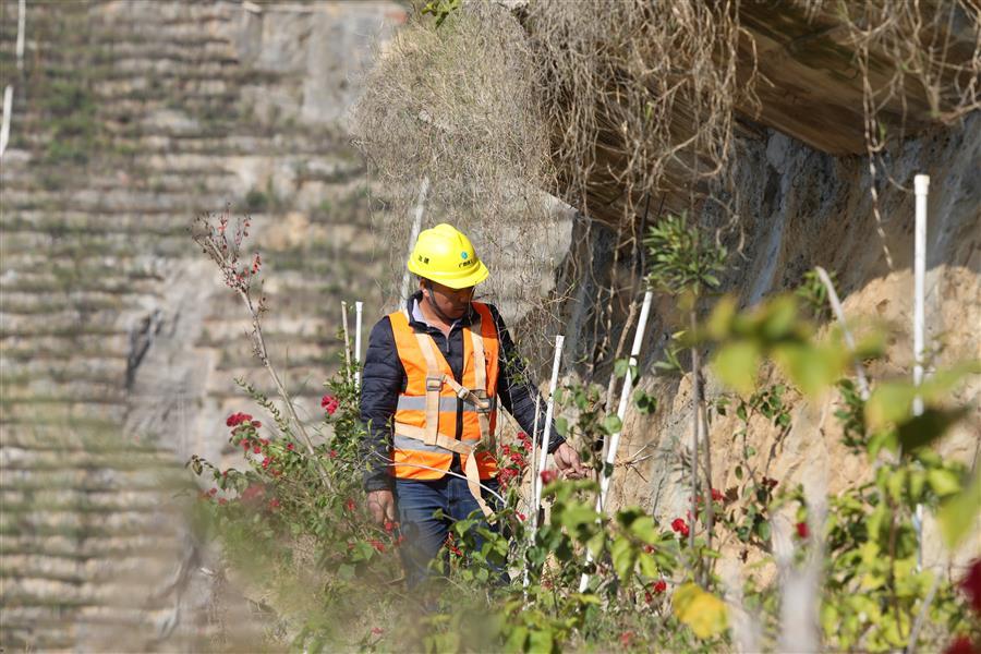 2021年12月19日,工人在樓梯山的峭壁上養(yǎng)護綠植。