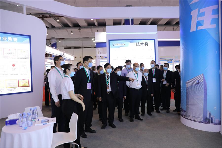 自治區(qū)住房和城鄉(xiāng)建設(shè)廳副廳長葉云(左二)、潘國雄(左三)一行到冶建公司展區(qū)參觀
