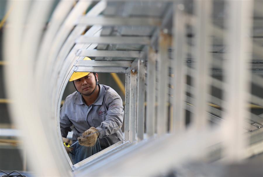 11月5日,工人在測量鋼構(gòu)架,準備安裝墻板。
