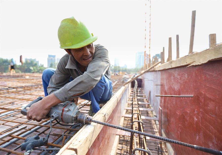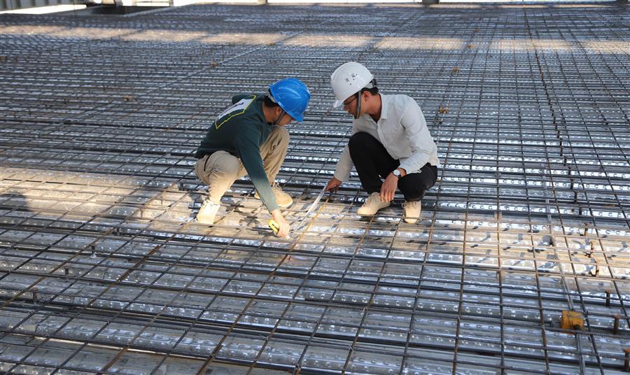 11月5日,工作人員在檢查已扎好的鋼筋網(wǎng)情況。